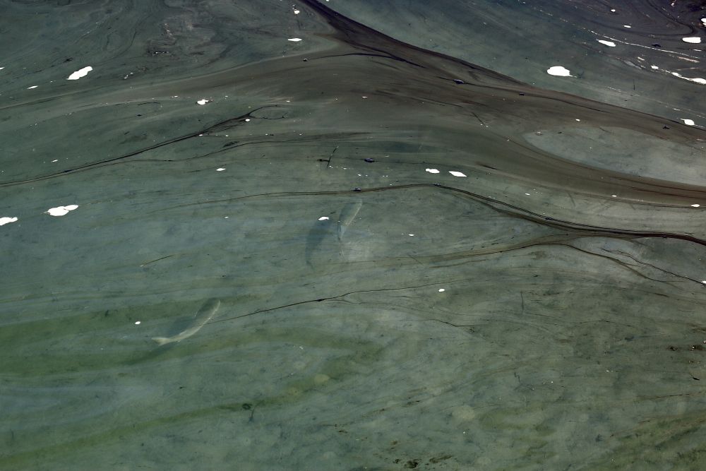 ↑10月4日,小鱼在美国加利福尼亚州奥兰治县亨廷顿比奇市被原油污染的海域里活动。