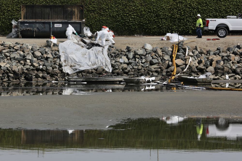 ↑10月4日,工作人员在美国加利福尼亚州奥兰治县沿海收集泄漏的原油。