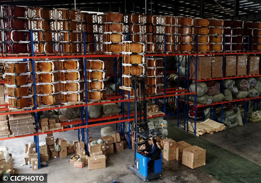 ↑2021年10月10日,湖南省娄底市双峰县经济开发区电子商务产业园的一物流仓库,工人们在装运藤椅。CICPHOTO/乃继辉 摄