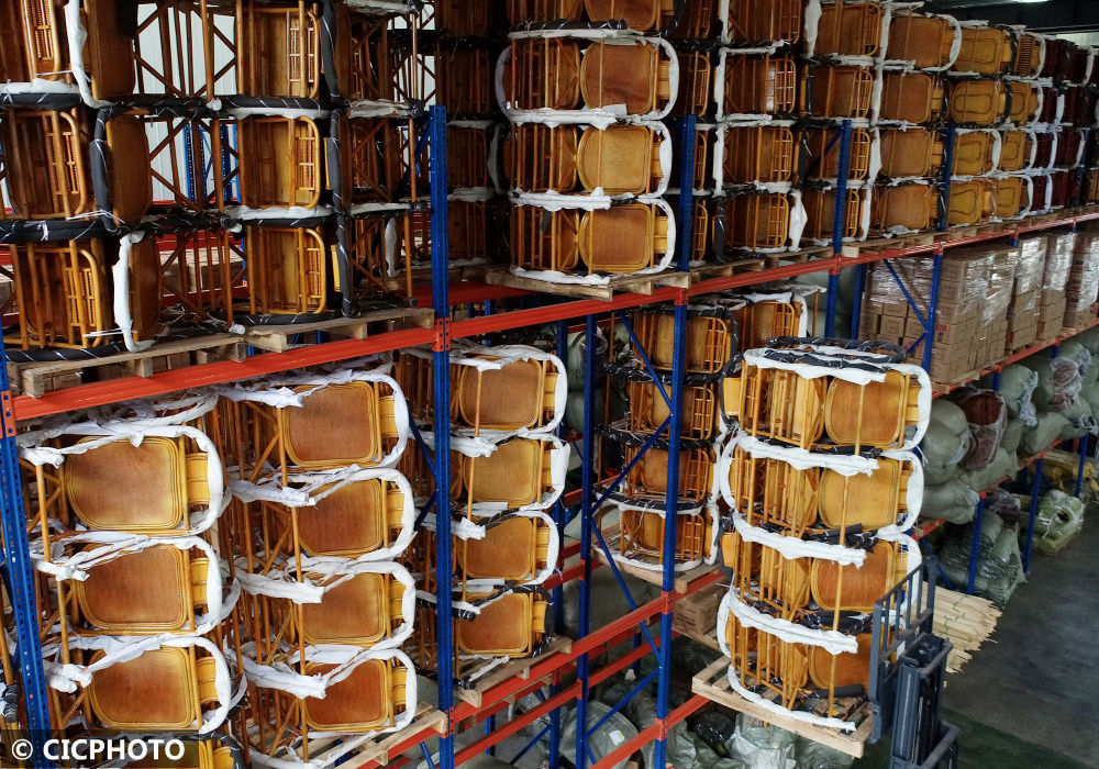 ↑2021年10月10日,湖南省娄底市双峰县经济开发区电子商务产业园的一物流仓库,工人们在将竹椅打包装箱。CICPHOTO/乃继辉 摄