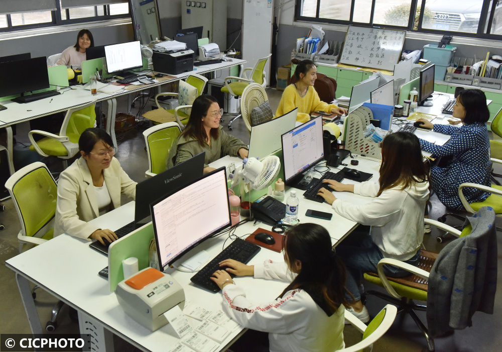 ↑2021年10月10日,湖南省娄底市双峰县经济开发区电子商务产业园,工作人员们在忙着接单。CICPHOTO/乃继辉 摄
