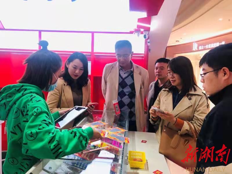 调研组一行来到长丰大道福潮·新概念店,深入了解销售厅转型发展后的设施布局、彩票销售、运营情况,详细了解当前福潮厅转型发展遇到的困难与问题,同时还到蒸湘区万达广场社会网点调研,体验了新票刮刮乐正当红玩法,与销售人员进行了交谈,询问销售情况、购买人群等。