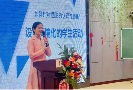 专题讲座环节,育英德景园小学张芳平副校长以《如何针对“图形的认识与测量”设计情景化的学生活动》为主题进行讲座,张校长从四种活动类型的实施策略上着手通过丰富多彩的案例与理论讲解,引导学员们学会在“空间与几何”单元教学中设计情景化的学生活动开展课堂教学。