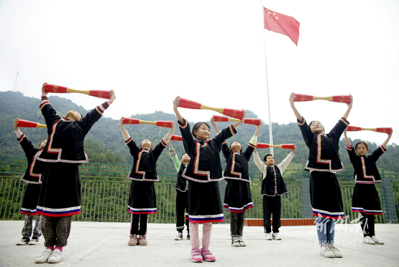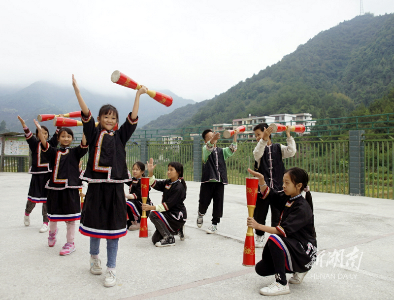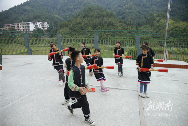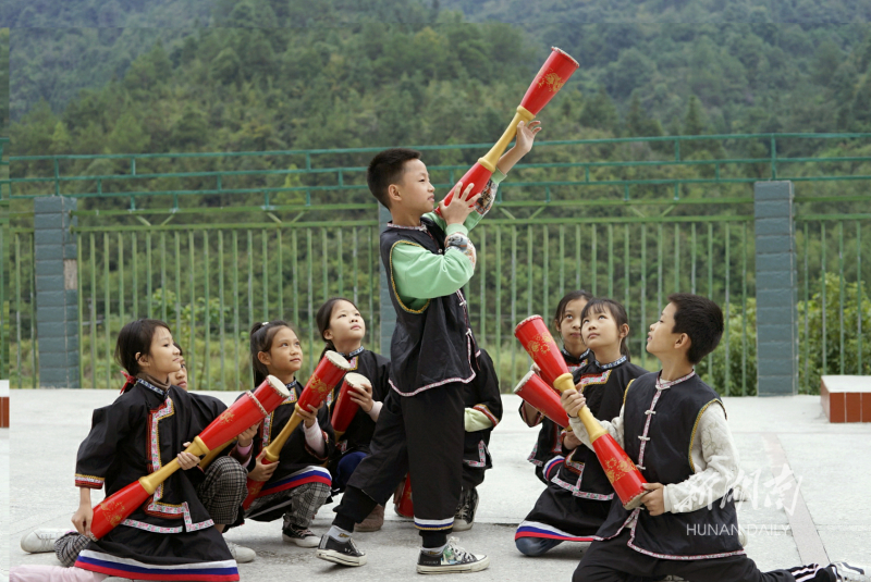 10月15日,宁远县棉花坪瑶族乡完全小学,学生在练习瑶族长鼓舞。近年,该校把竹杠舞、长鼓舞等传统民族体育项目引入课堂,让学生在强身健体的同时,传承发展瑶族文化。黄建军 王伟 摄影报道