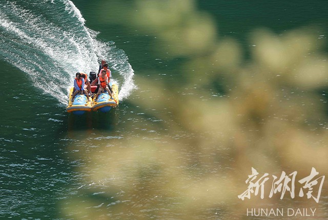 10月3日,游人在风景区体验水上漂流项目。吴勇兵 摄