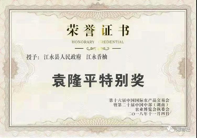吃就要吃最好的,江永香柚可谓是柚中“爱马仕”,在2018年江永香柚荣膺“袁隆平特别奖”,被中华水果流通协会命名为“中华名果”,是湖南省首届十大农业品牌产品。