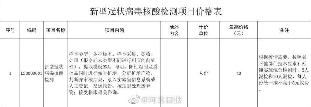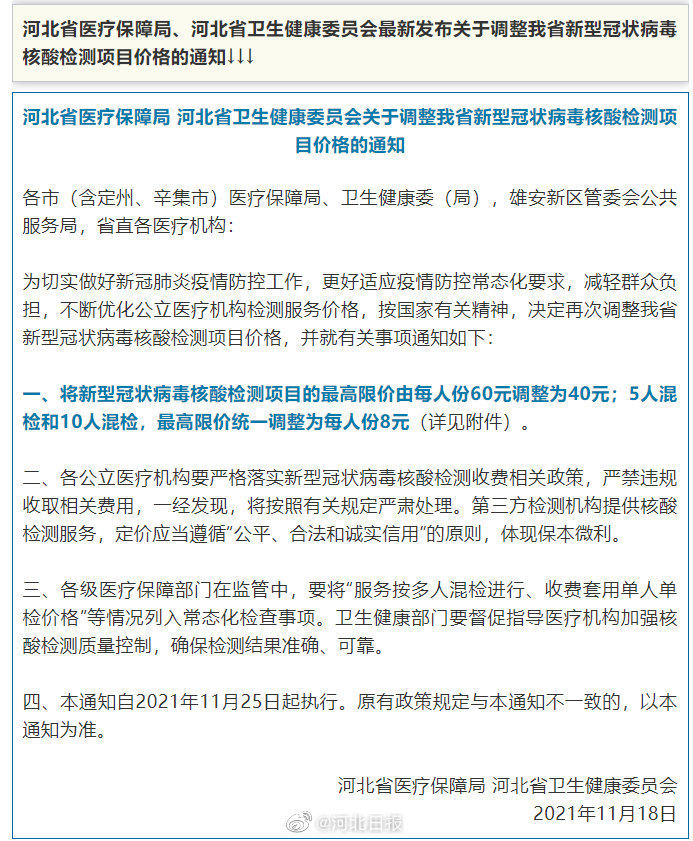 河北省医疗保障局、河北省卫生健康委员会最新发布关于调整河北省新型冠状病毒核酸检测项目价格的通知,为切实做好新冠肺炎疫情防控工作,更好适应疫情防控常态化要求,减轻群众负担,不断优化公立医疗机构检测服务价格,根据国家有关政策要求,河北省在京津冀率先再次降低核酸检测项目价格。明确自2021年11月25日起,新型冠状病毒核酸检测项目的最高限价由每人份60元调整为40元;5人混检和10人混检,最高限价由每人份25元、15元统一调整为8元。同时要求,各公立医疗机构要严格落实新型冠状病毒核酸检测收费相关政策,严禁“服务按多人混检进行、收费套用单人单检价格”。