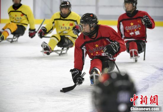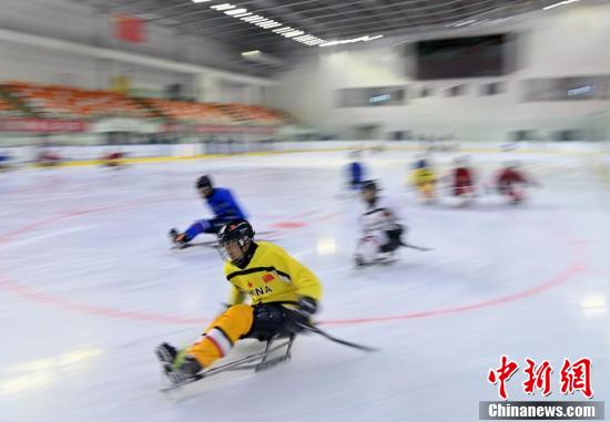 11月22日,中新社记者前往位于北京市顺义区的中国残疾人奥林匹克运动管理中心,探访中国残奥冰球队在此备战2022年北京冬残奥会的情况。北京2022年冬残奥会将于2022年3月4日开幕。图为队员们进行速度训练。
