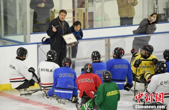 中国残奥冰球队俄罗斯籍教练尼古拉(站立者左一)为队员们讲解训练安排。