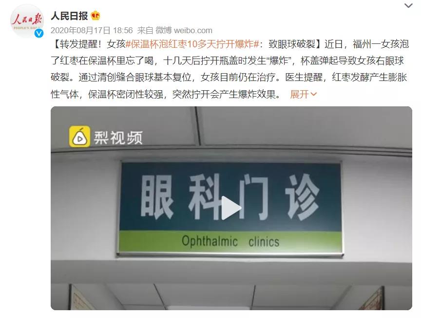 2020年8月,福州一女孩用保温杯泡红枣却忘了喝,十几天后拧开保温杯时发生“爆炸”,杯盖弹起导致女孩右眼球破裂;