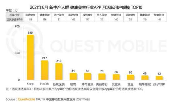 根据QuestMobile数据显示,新中产人群使用健康美容行业APP中,月活跃用户规模前五分别为:Keep、health、新氧医美、咕咚、薄荷健康。
