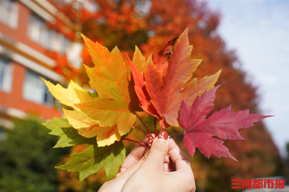 最近一周长沙的太阳相当给力,一些枫树在昼夜温差的刺激下也率先“红了脸庞”。在湖南农大的这条网红枫叶路上,枫树枝头就挂着红、橙、黄、绿多种颜色的树叶。(图 顾荣)
