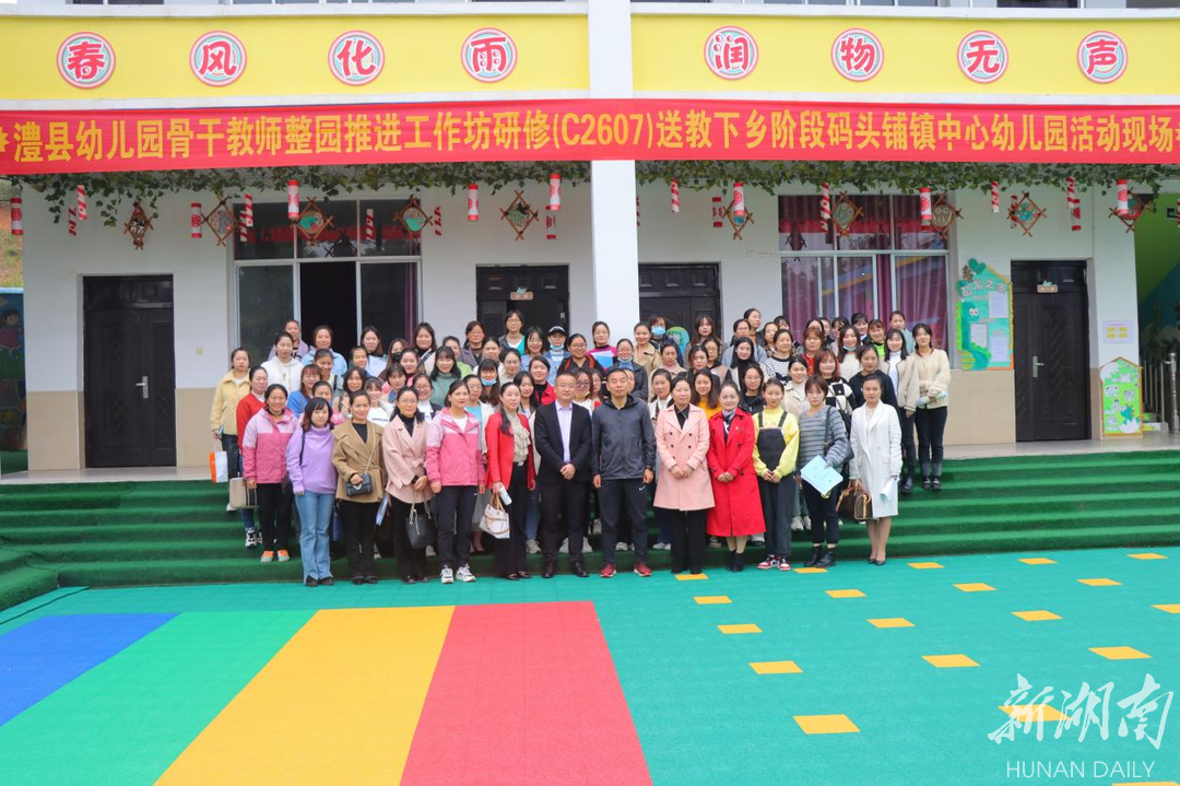 11月3日,"国培计划(2021)"——澧县幼儿园骨干教师整园推进工作坊研修(C2607)第一次送教活动在澧县码头铺镇中心幼儿园举行。澧县教师进修学校副校长毛彩东、高教站站长皮春蓉、教师皮辉勇,澧县码头铺镇中学校长孙汉芳、副校长汪志刚、幼儿园园长吴林静,工作坊坊主夏丽春及工作坊主持人团队成员、工作坊80名学员,码头铺镇各幼儿园园长、骨干教师共100余人全程参与研修活动。