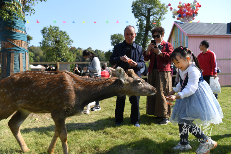 11月12日,游客与小鹿互动嬉戏。当天,长沙园林生态园鹿岛公园正式开园,首批9只经过驯化的小鹿与游客见面。 湖南日报全媒体记者 田超 摄