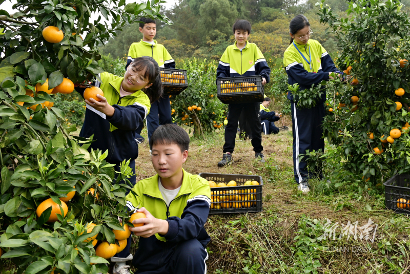 11月5日,洞口县竹市镇炉山村柑橘园,学生在采摘柑橘。当天,该县竹市镇中学组织学生到附近柑橘园采摘柑橘,让学生体验劳动的乐趣与艰辛,引导学生树立劳动光荣的美德。滕治中 米赛男 摄影报道