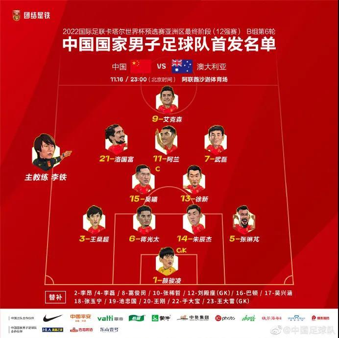 与澳大利亚的次回合比赛,艾克森、洛国富、阿兰和蒋光太悉数首发。图片来源:中国足球队。