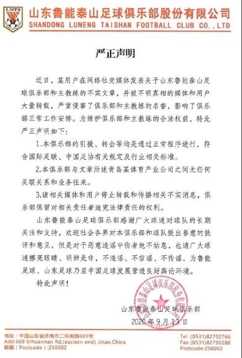 山东泰山队曾为李霄鹏身陷被举报风波发布声明。