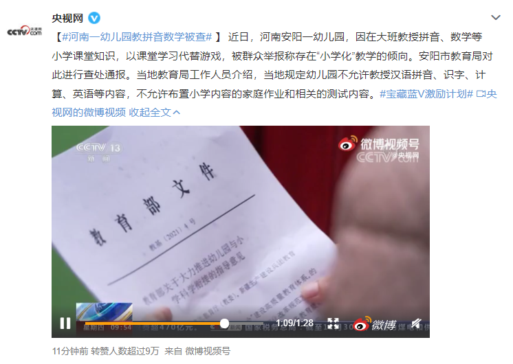 近日,河南安阳一幼儿园,因在大班教授拼音、数学等小学课堂知识,以课堂学习代替游戏,被群众举报称存在“小学化”教学的倾向。安阳市教育局对此进行查处通报。当地教育局工作人员介绍,当地规定幼儿园不允许教授汉语拼音、识字、计算、英语等内容,不允许布置小学内容的家庭作业和相关的测试内容。