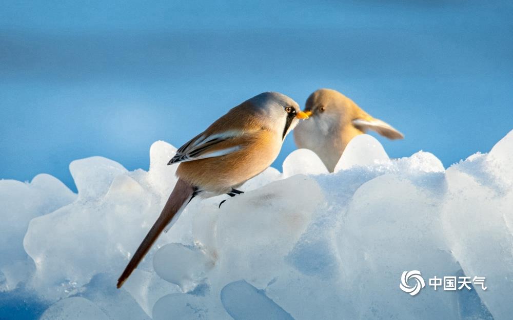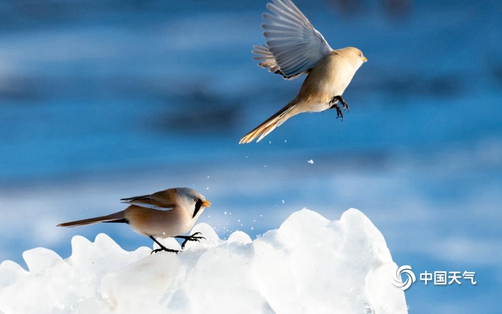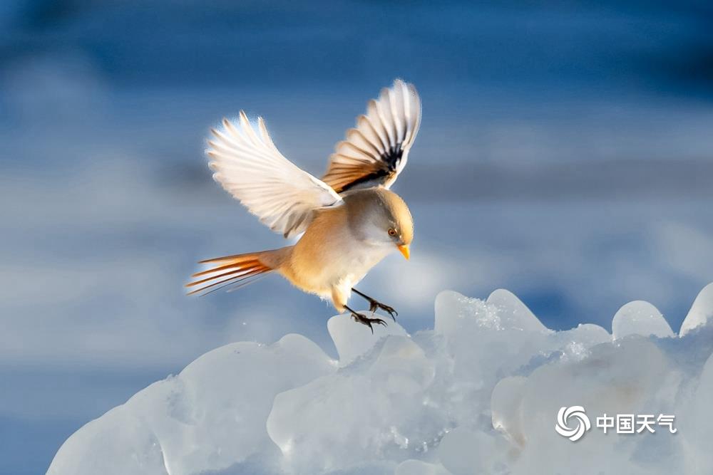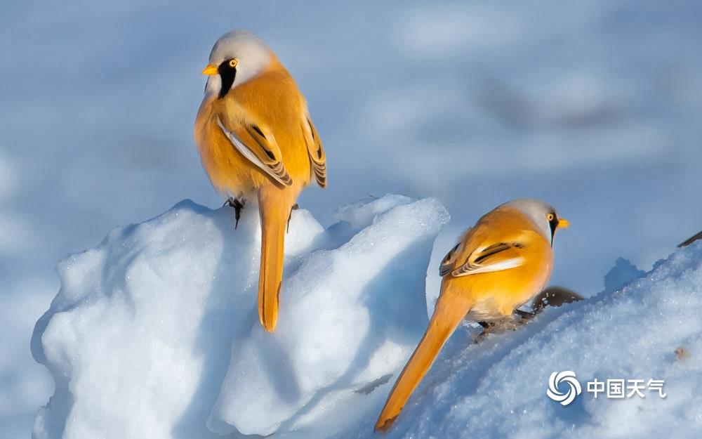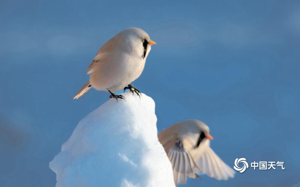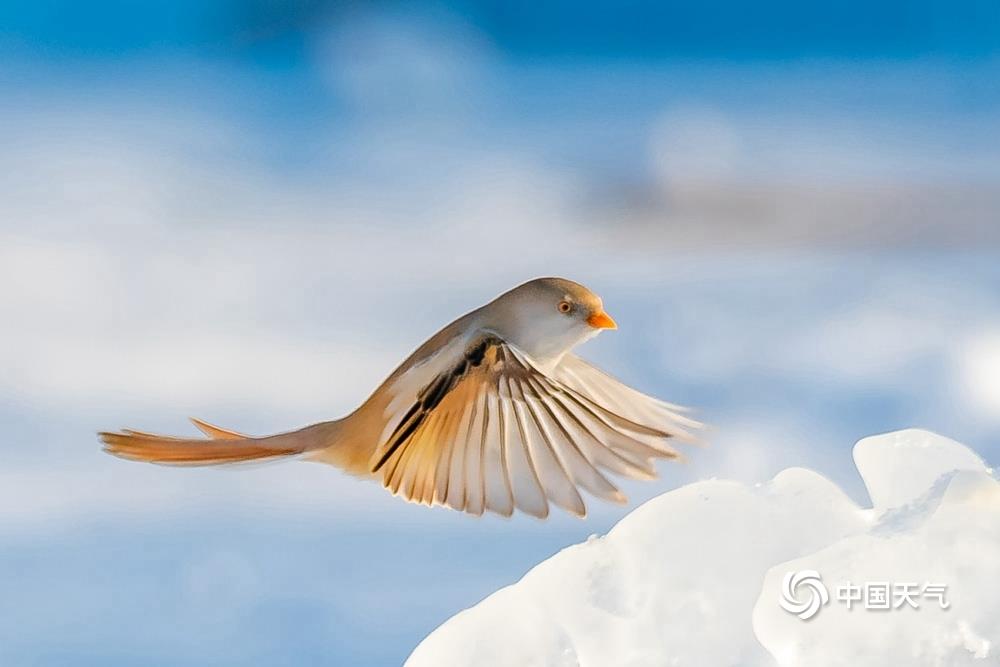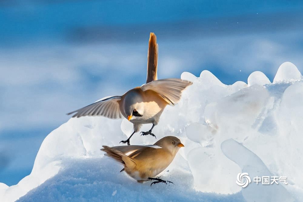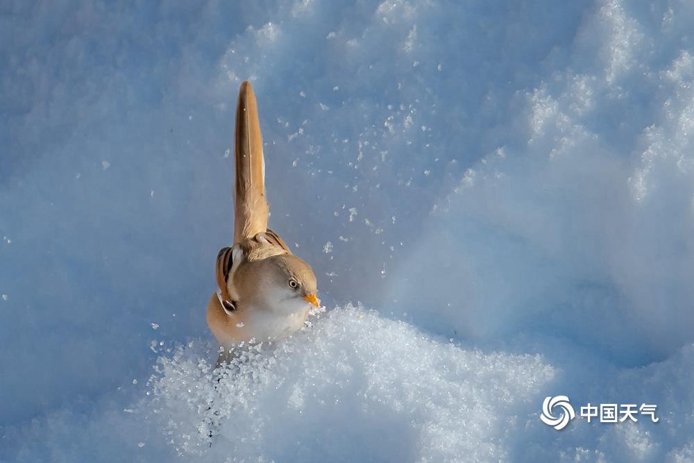 12月1日清晨,黑龙江大庆湿地,阳光照耀下的芦苇丛中,美丽可爱的文须雀在雪地里翻飞跳跃,犹如冬日里的小精灵。