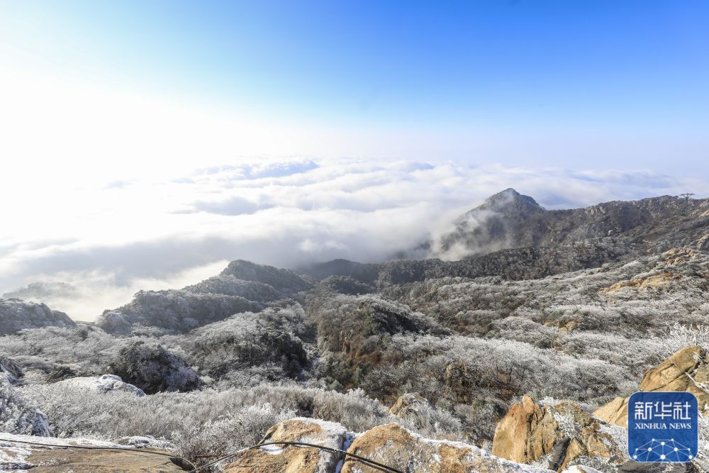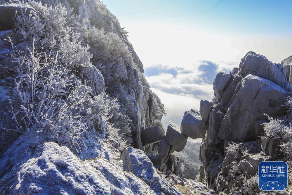 12月14日在泰山景区拍摄的雾凇景观与云海。
