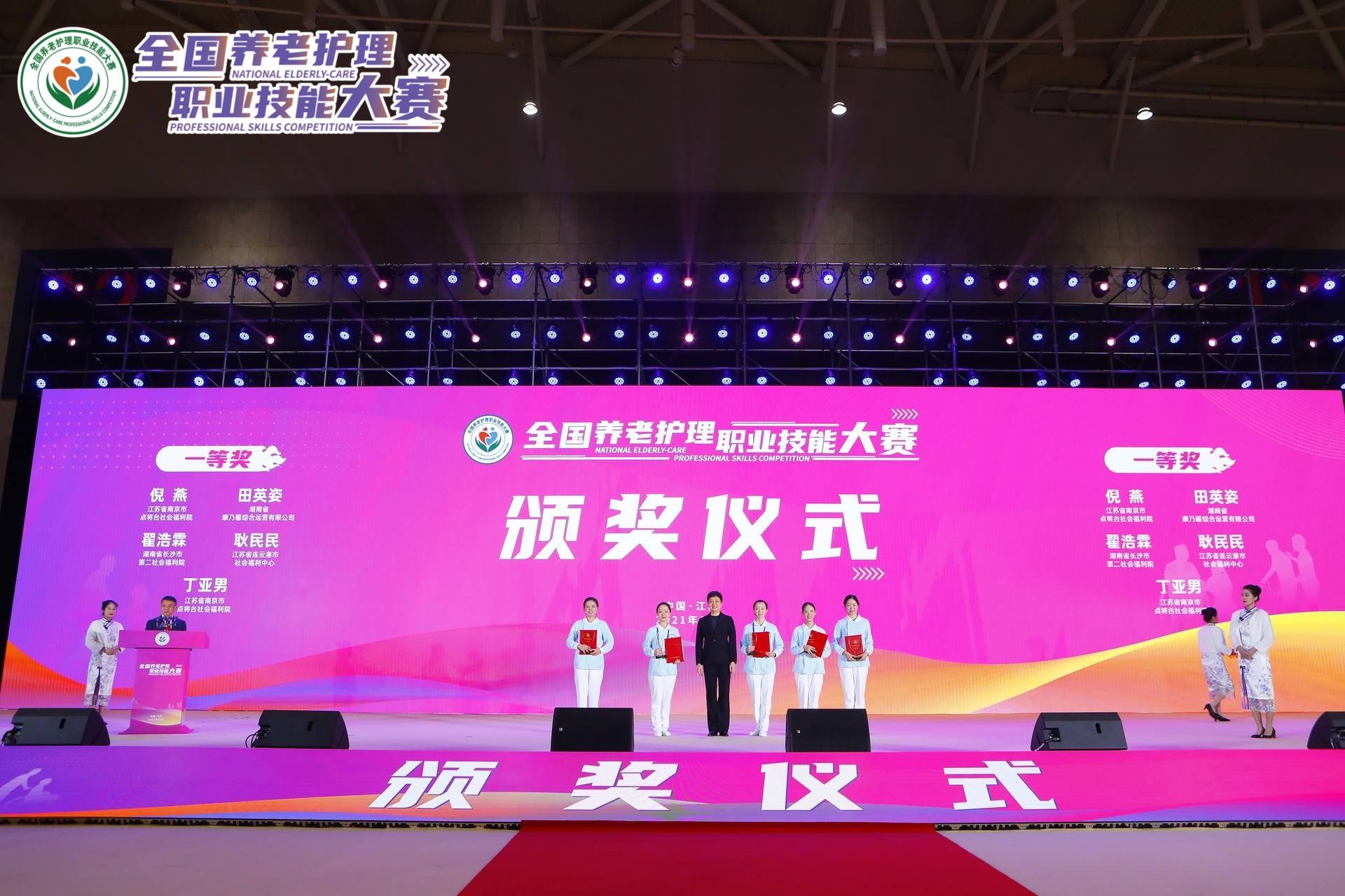 湖南康乃馨综合运营有限公司护理员田英姿、长沙市第二社会福利院护理员翟浩霖荣获大赛一等奖,湘潭市普亲春花老年养护有限公司护理员陈望满、长沙市第二社会福利院护理员姚楠荣获大赛二等奖。湖南师范大学王卫红教授、保险职业学院谢隽教授荣获大赛“优秀教练”奖,长沙民政职业技术学院唐莹教授荣获“优秀工作者”。一等奖选手将被授予“全国技术能手”称号,一、二等奖选手可按规定晋升职业技能等级。