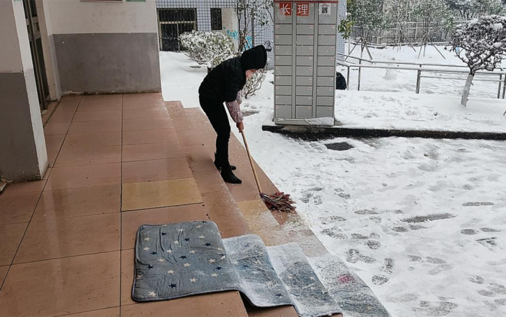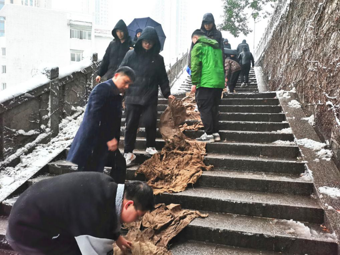 为防止学生摔倒,公寓中心还紧急调运了麻袋等防滑物资,贴心为每栋学生公寓门口都铺了防滑地毯,摆放了“防滑”警示标志,置备了工业盐防止夜间结冰,在寒冷的冬日为往返公寓的学生送去别样的温暖。