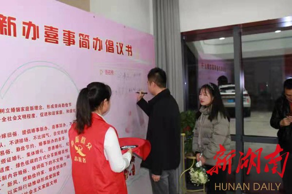 当天的婚姻登记志愿服务活动就以“推广新婚俗”为主题,新人们在领证之后现场宣读“婚事新办、喜事简办”倡议书,向广大市民、青年朋友们发出倡议:崇尚勤俭节约,不讲排场,不比阔气;倡导简约婚礼,以简约适度、绿色低碳的方式分享新婚喜悦;引领文明新风,自觉抵制不文明“闹婚”行为,弘扬“低彩礼、零彩礼”新风。