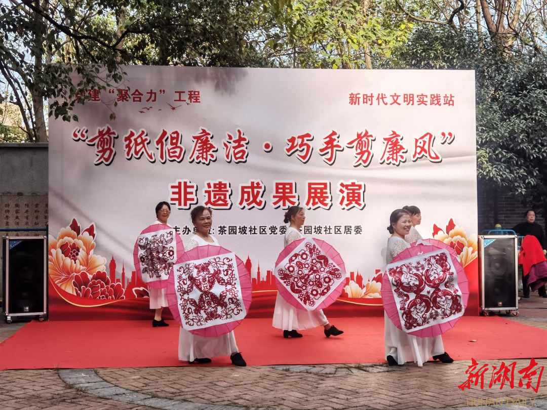 新湖南客户端12月3日讯(通讯员 孙小晋)12月3日下午,在长沙市雨花区砂子塘街道茶园坡社区上演了一场生动的“剪纸倡廉洁·巧手剪廉风”非遗成果展演活动。社区志愿者将剪纸作品与文艺演出服装结合起来,让社区居民群众通过非遗剪纸艺术的魅力,感受到了廉政文化,引导居民群众在参与中自觉增强廉洁意识。