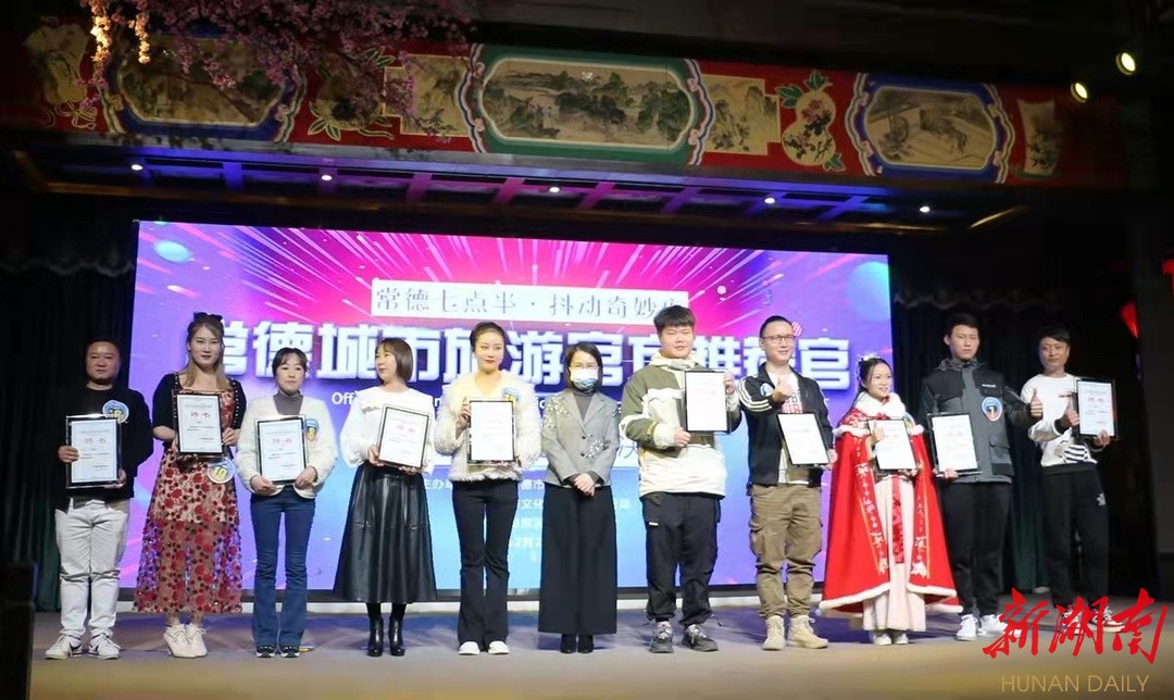 (柳叶湖旅游度假区党工委委员、工会主任游澜波为“2022年度常德城市旅游推荐官”颁发聘书)