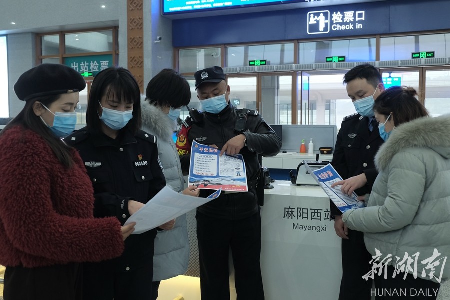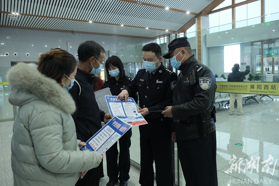 12月24日,麻阳苗族自治县公安局联合怀化铁路公安处麻阳车站派出所,组织民警走进麻阳西站开展“平安高铁 金盾护航”宣传活动,通过耐心细致地为广大旅客宣讲安全出行注意事项,极大提高了旅客安全意识,为高铁出行增添了一份平安。湖南日报全媒体记者 卢嘉俊 通讯员 刘文涛 摄影报道