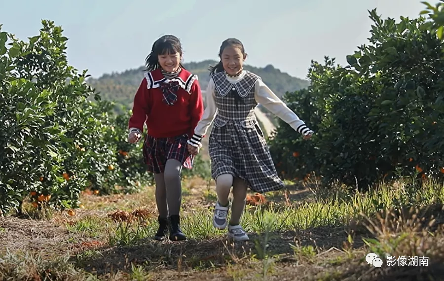 小朋友在脐橙种植基地里奔跑嬉戏。