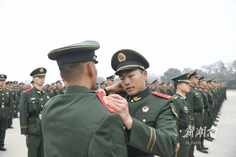 12月8日,新兵互相佩戴警衔。当天,武警湖南总队隆重举行2021年秋季新兵授衔暨宣誓仪式,1700余名新兵被授予列兵警衔,成为光荣的武警战士,迎接属于他们的军旅“成人礼”。湖南日报全媒体记者 辜鹏博 通讯员 刘粤商 摄影报道