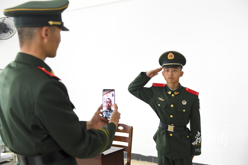 12月8日,新兵吴鑫让战友帮忙举着手机,郑重地向屏幕那边的父亲敬军礼。当天,武警湖南总队隆重举行2021年秋季新兵授衔暨宣誓仪式,1700余名新兵被授予列兵警衔,成为光荣的武警战士,迎接属于他们的军旅“成人礼”。湖南日报全媒体记者 辜鹏博 通讯员 刘粤商 摄影报道