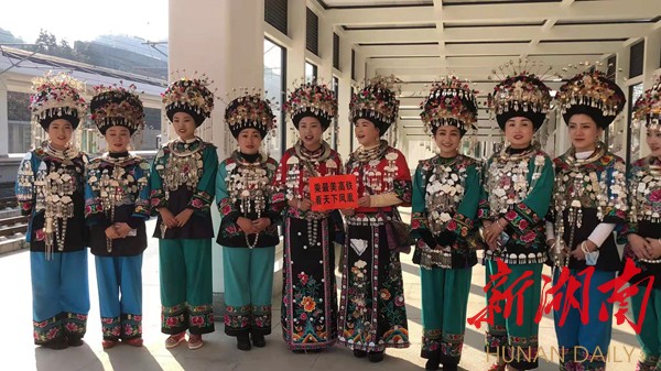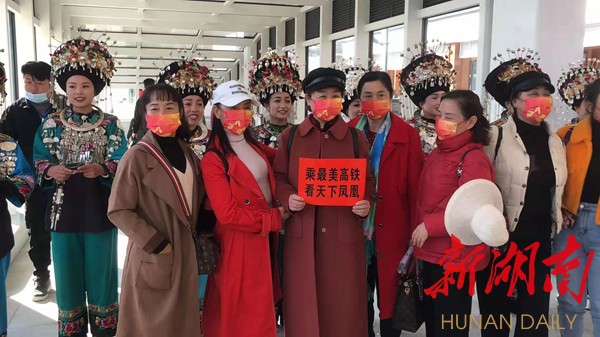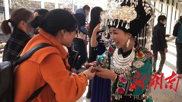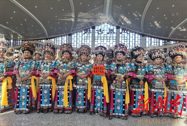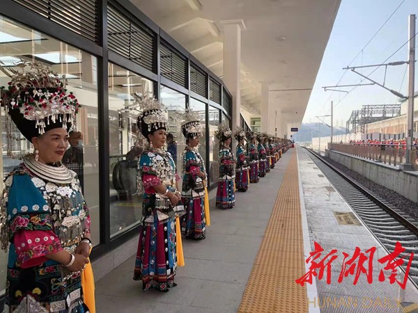 “今天我们凤凰古城通高铁了,非常的开心和激动,欢迎大家乘坐最美高铁来咱们最美凤凰古城游山玩水,来咱们美丽的古苗寨做客,品尝咱们苗家糯米甜酒,让大家喝在嘴里甜在心里,让大家玩在凤凰,醉在凤凰。”身着苗族盛装苗家阿妹吴诗宁热情地说。