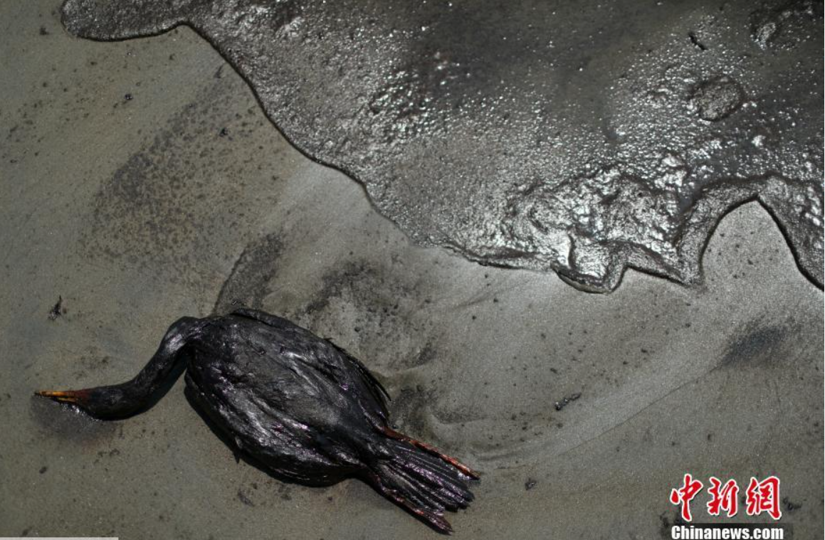 当地时间1月18日,秘鲁Ventanilla,沾满油污的海鸟死在海滩上。