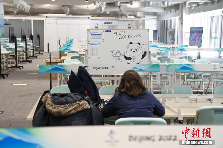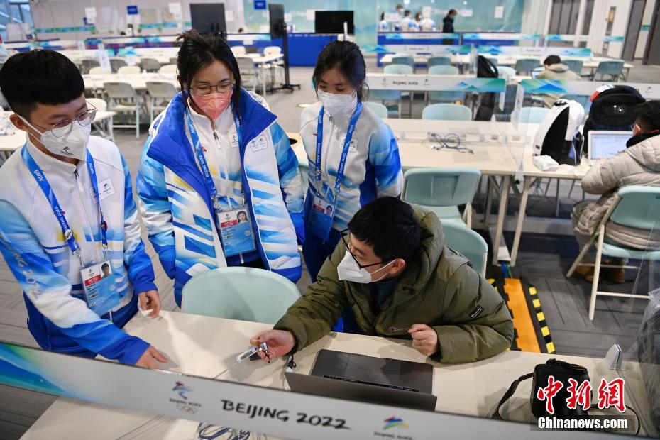1月28日,志愿者在主媒体中心内向记者介绍媒体工作间设施。当日,2022年北京冬奥会和冬残奥会主媒体中心迎来媒体记者注册高峰。 中新社记者 毛建军 摄
