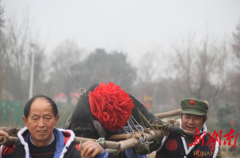 上午10点,稻花香里农耕文化园的晒谷坪就已经热闹起来,来自四面八方的游客慕名来到这里。长沙中悦旅游发展有限公司董事长杨雄军为狮子点睛,瑞狮苏醒,顿时脚踏欢快的鼓点在台上时而跳跃,时而登高,时而眨眼,神气十足。稻花香里农耕文化园运营总监张波为本次活动致欢迎辞后,鞭炮声响起,身着喜庆服装的工作人员,抬着年猪来到晒谷坪。