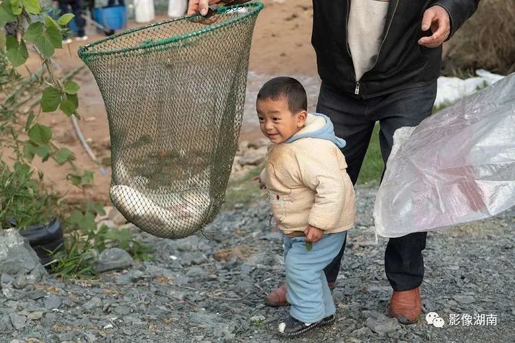 ▲永兴县便江村曹家组曹小英家鱼塘,一名小孩好奇地看着网里的活鱼。