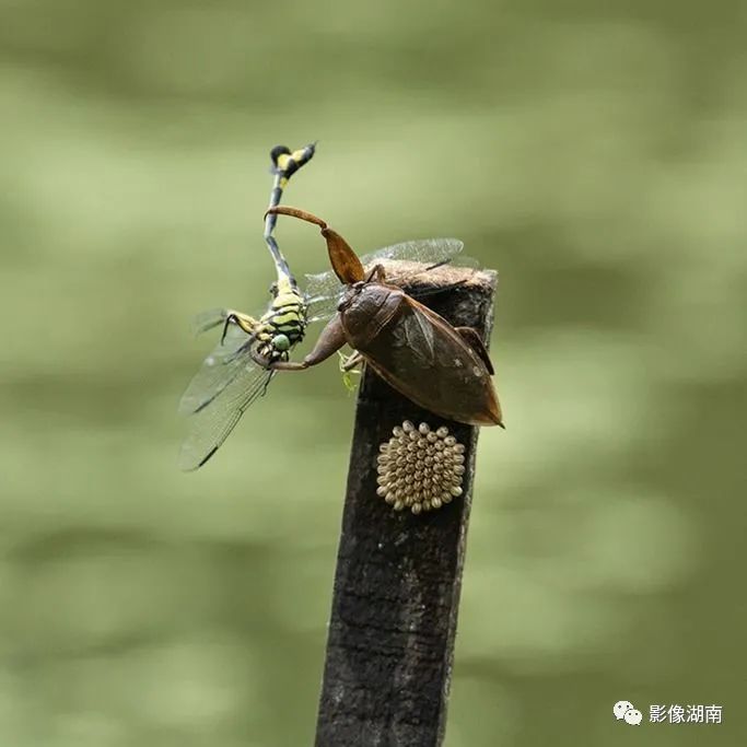 ▲产卵期的田鳖保护意识很强,为保护卵,田鳖向飞来的蜻蜓发起攻击并将蜻蜓打败。