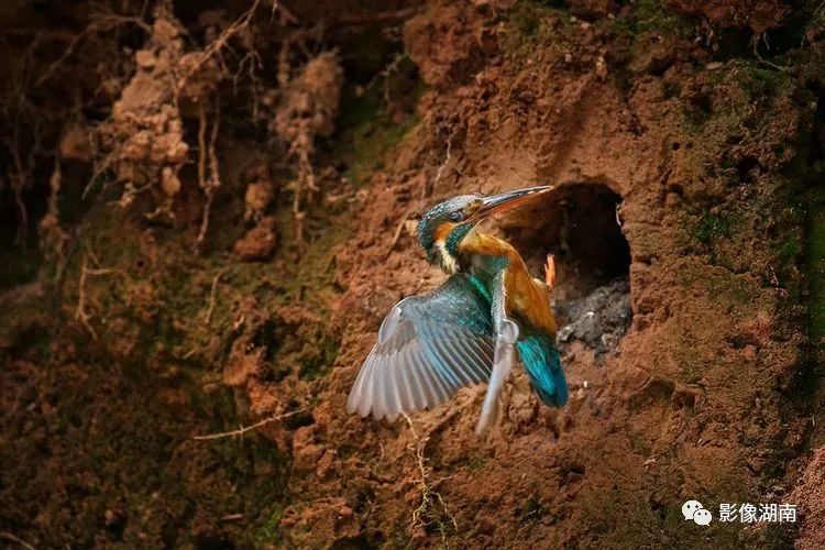 ▲永兴县观前村,翠鸟抓了一条小鱼给窝里的幼崽喂食。