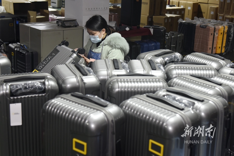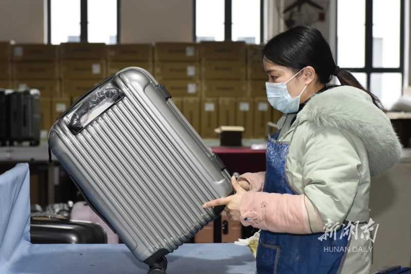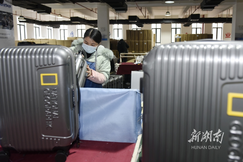 1月22日,蓝山县皮具箱包科技产业园奇秀科技有限公司,员工在赶制一批出口拉杆箱。连日来,该县皮具箱包、玩具企业在做好疫情防控基础上积极拓展海外市场,加快新产品研发和生产,力争夺取新年首月“开门红”。杨雄春 摄