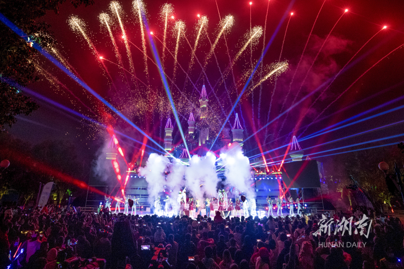 2021年12月31日晚,株洲方特欢乐世界,璀璨的灯光照亮夜空。当天,vivo S12麓山音乐节在株洲方特欢乐世界上演,游客一起在大型烟花秀中倒计时,迎接新年的到来。湖南日报全媒体记者 辜鹏博 通讯员 周鹏伟 摄影报道