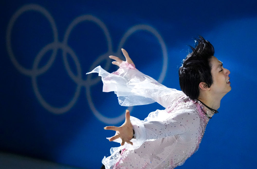 ↑2月20日,日本选手羽生结弦在表演滑中。 新华社记者 王菲 摄