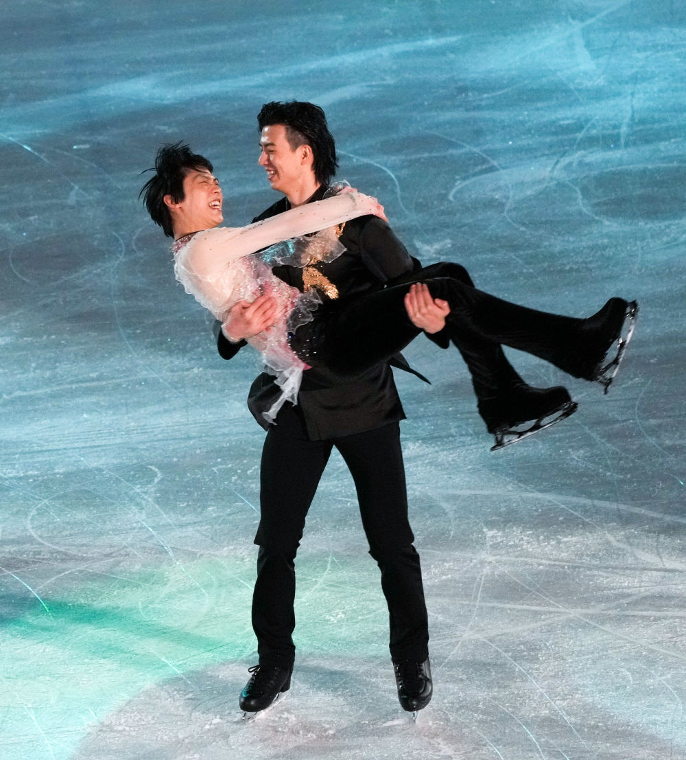 ↑2月20日,中国选手柳鑫宇(右)在表演滑结束后抱起日本选手羽生结弦。新华社记者 王毓国 摄