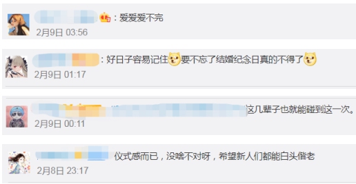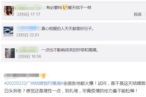还有部分网友表示,“有必要吗?哪天结不一样”“真心相爱的人天天都是好日子”“一点也不影响将来的吵架和离婚”“理性一点,别扎堆,毕竟疫情防控不能松懈”。