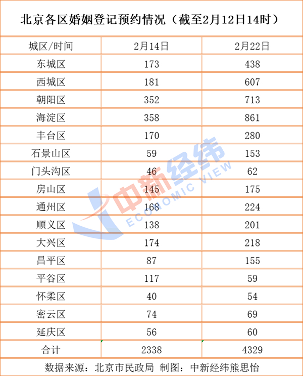 中新经纬查询北京市民政局官网发现,截至2月12日14时,北京已有4329对新人预约2月22日领证,预约量远超情人节当天的2338对。