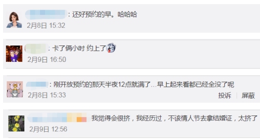 有打算领证的新人现身说“法”,“还好预约的早”“卡了俩小时!约上了”“刚开放预约的那天半夜12点就满了”……不过也有过来人友情提示,“我经历过,不该情人节去拿结婚证,太挤了!”