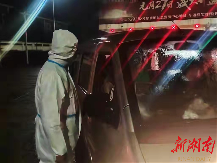 在宁远北高速路口,禾亭镇卫生院医务人员正在按照健康监测点工作流程,查验来宁返宁人员相关信息。