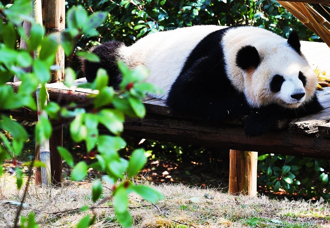 2月25日,长沙生态动物园,大熊猫慵懒的躺在竹床上。湖南日报全媒体记者 徐行 摄