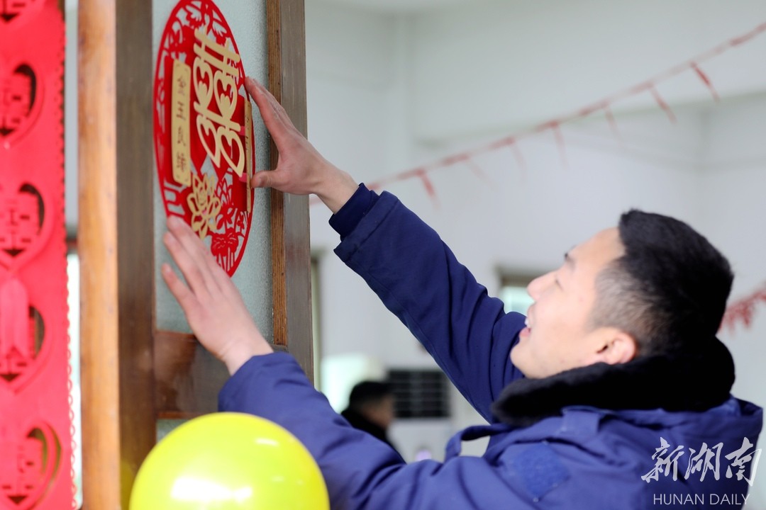 (队友们贴喜字)
